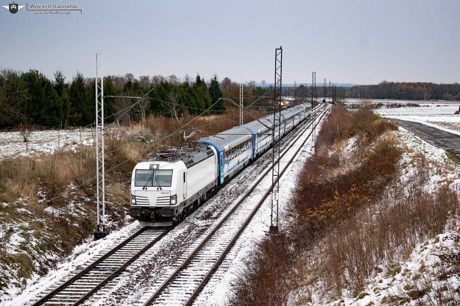 24.11.2024 | Gierałtowice | Szlak podg.Gierałtowice-Knurów | 6193 977 z pociągiem spółki PKP Intercity jedzie w kierunku Knurowa.