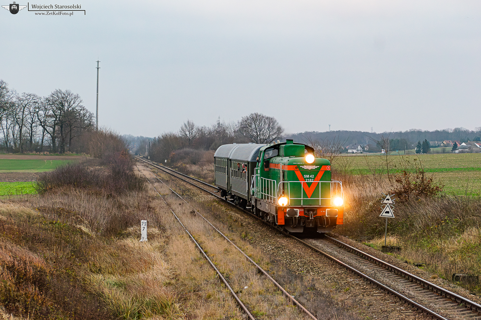 14.12.2024 | Pokrzywnica | Szlak podg.Kędzierzyn-Koźle Zachodnie - Twardawa | SM42-2182 z dwoma wagonami 94A w relacji Gliwice Łabędy-Kłodzko Główne pokonuje szlak podg.Kędzierzyn-Koźle Zachodnie - Twardawa, w kierunku Twardawy. Skład zbliża się do p.o Pokrzywnica. Tor szlakowy widoczny po lewej stronie jest nieczyny od wielkiej powodzi która miała miejsce w 1997 roku. Sam skład był "Misją specjalną" TOZKiOS do Kłodzka w celu zabrania wagonu Kddt.