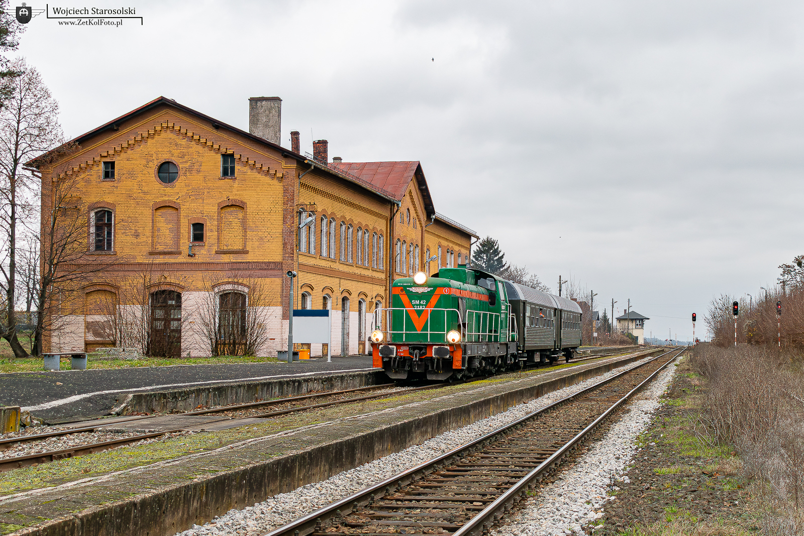 14.12.2024 | Głogówek | Stacja Głogówek | SM42-2182 z dwoma wagonami 94A mija w/w stację w kierunku Racławic Śląskich.