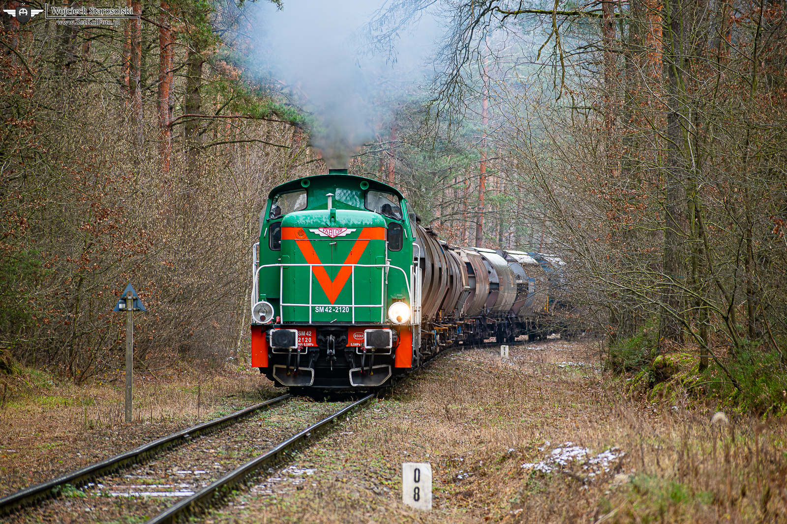 03.01.2025 | Olszewice | Bocznica kopalni piasku kwarcowego "Grudzeń Las"| SM42-2120 z charakterystycznymi wagonami NACCO jedzie ze stacji Bratków do kopalni piasku kwarcowego "Grudzeń Las". Skład ten po załadunku i wyciągnięciu do Bratkowa pojedzie do Dąbrowy Górniczej Wschodniej na czele z 311D TKP Silesia.