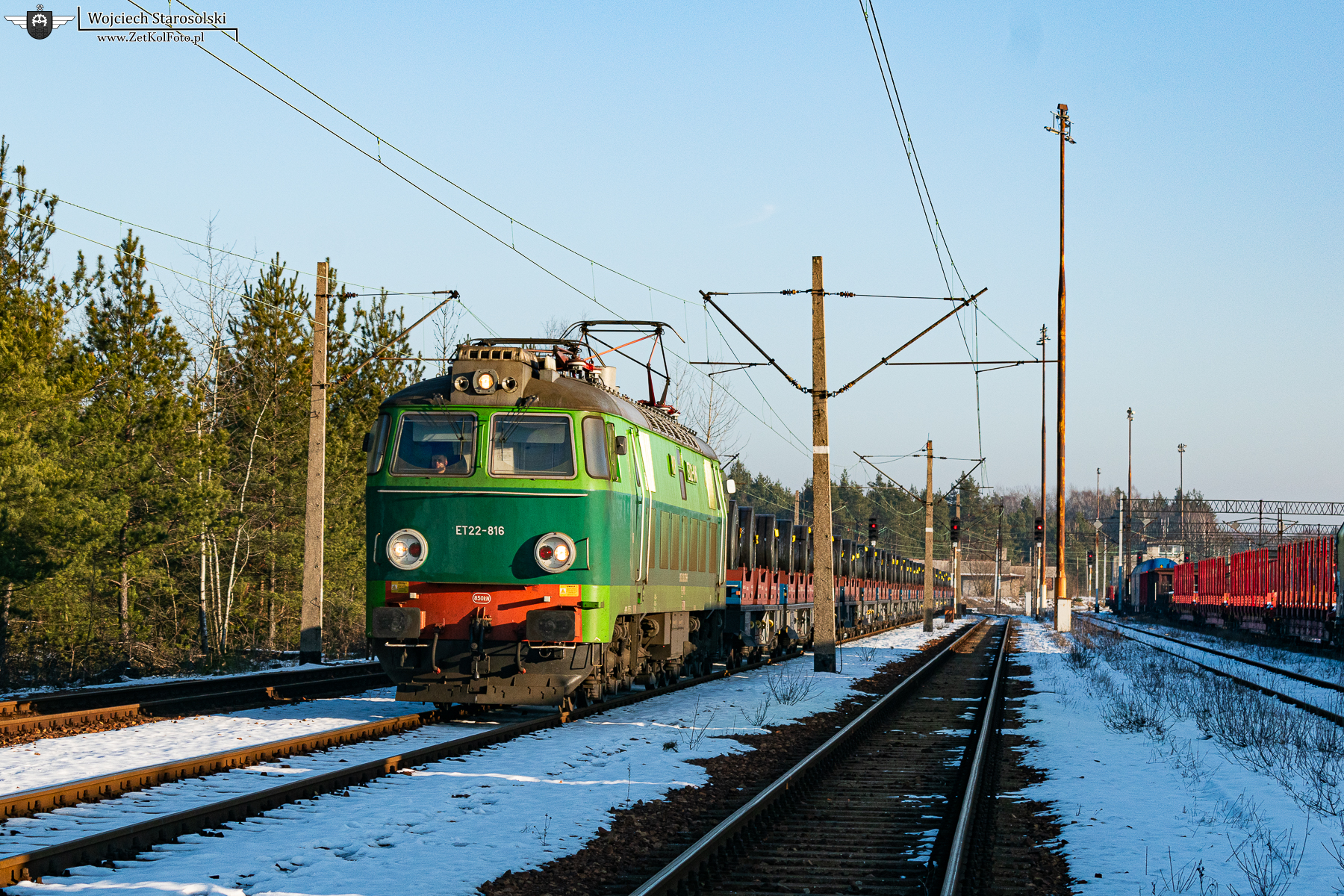 18.01.2025 | Jaworzno | Stacja Jaworzno Szczakowa, okręg JSE | ET22-816 z platformami mija okręg JSE w/w stacji, jadąc docelowo do Katowic Zawodzia.