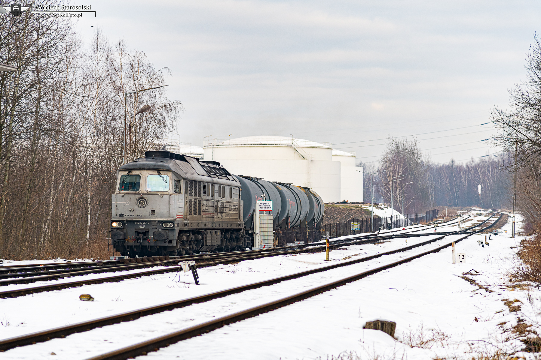 24.01.2025 | Piekary Śląskie | Stacja Piekary Śląskie Szarlej | BR232 457-2 wyciąga skład beczek z bazy paliw TanQuid do w/w stacji.