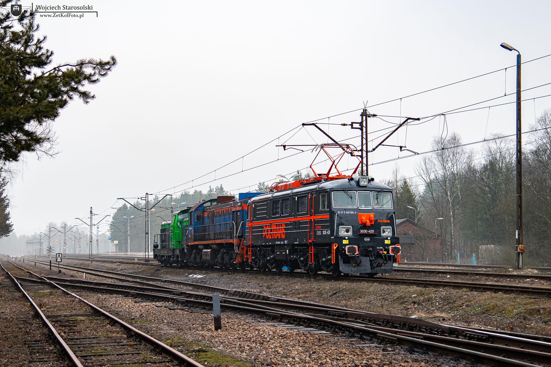24.02.2025 | Jaroszowiec Olkuski | Stacja Jaroszowiec Olkuski | 303E-420 (EU07-520) wraz z TEM2-133 i SM42-1118 stoją na stacji Jaroszowiec Olkuski. Tamara 133 była transportowana na naprawę.