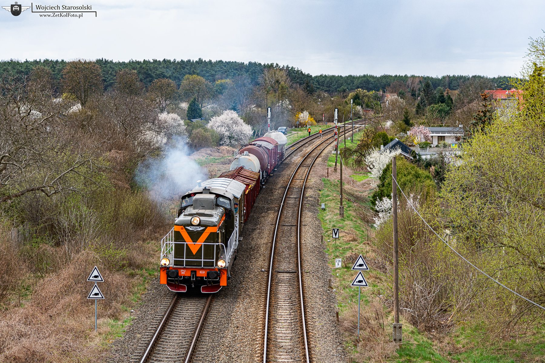 06.04.2025 | Leszno | Szlak Leszno-Lasocice | SP42-001 z pociągiem towarowym pokonuje w/w szlak, zbliżając się do Leszna.