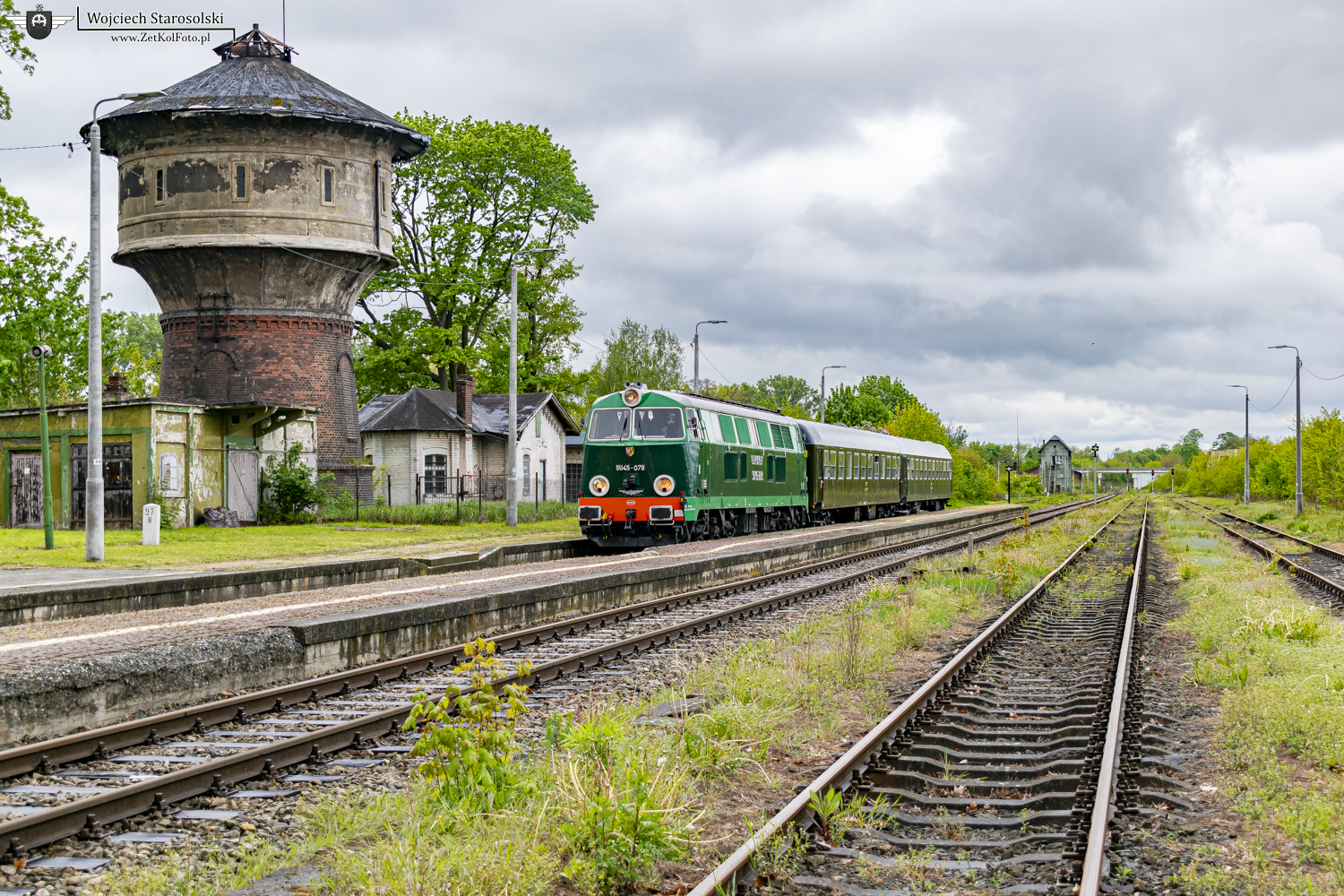 20.04.2024 | Racławice Śl. | St.Racławice Śl. | SU45-079 z wagonami retro pozuje do zdjęć obok wieży ciśnień w w/w stacji.