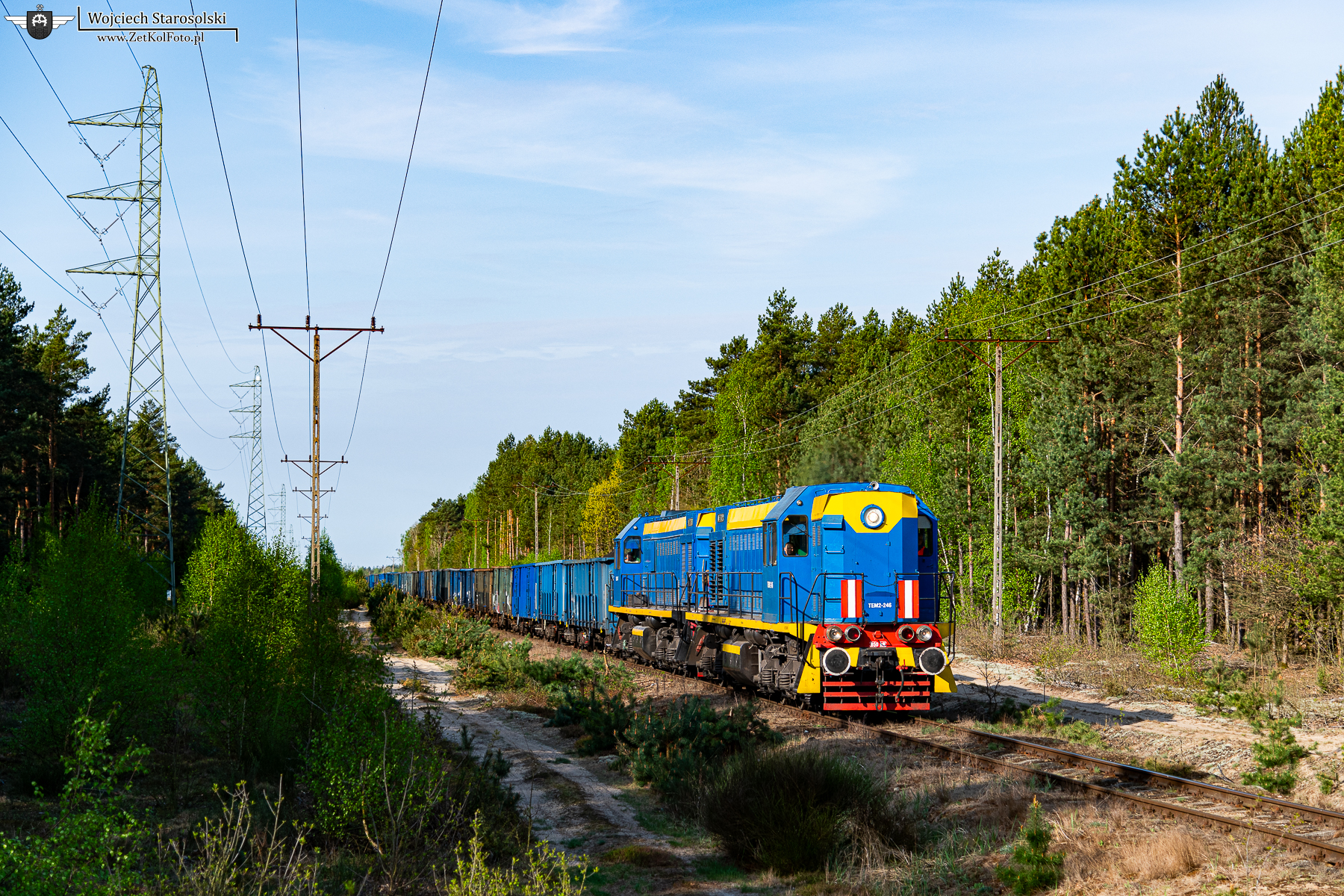 22.04.2025 | Kossobudy | Bocznica cukrowni Glinojeck | TEM2-246 w duecie z TEM2-247 prowadzą ładowny skład węglarek ze stacji Raciąż do cukrowni w Glinojecku, pokonując malowniczą, około 13-kilometrową bocznicę tegoż zakładu.