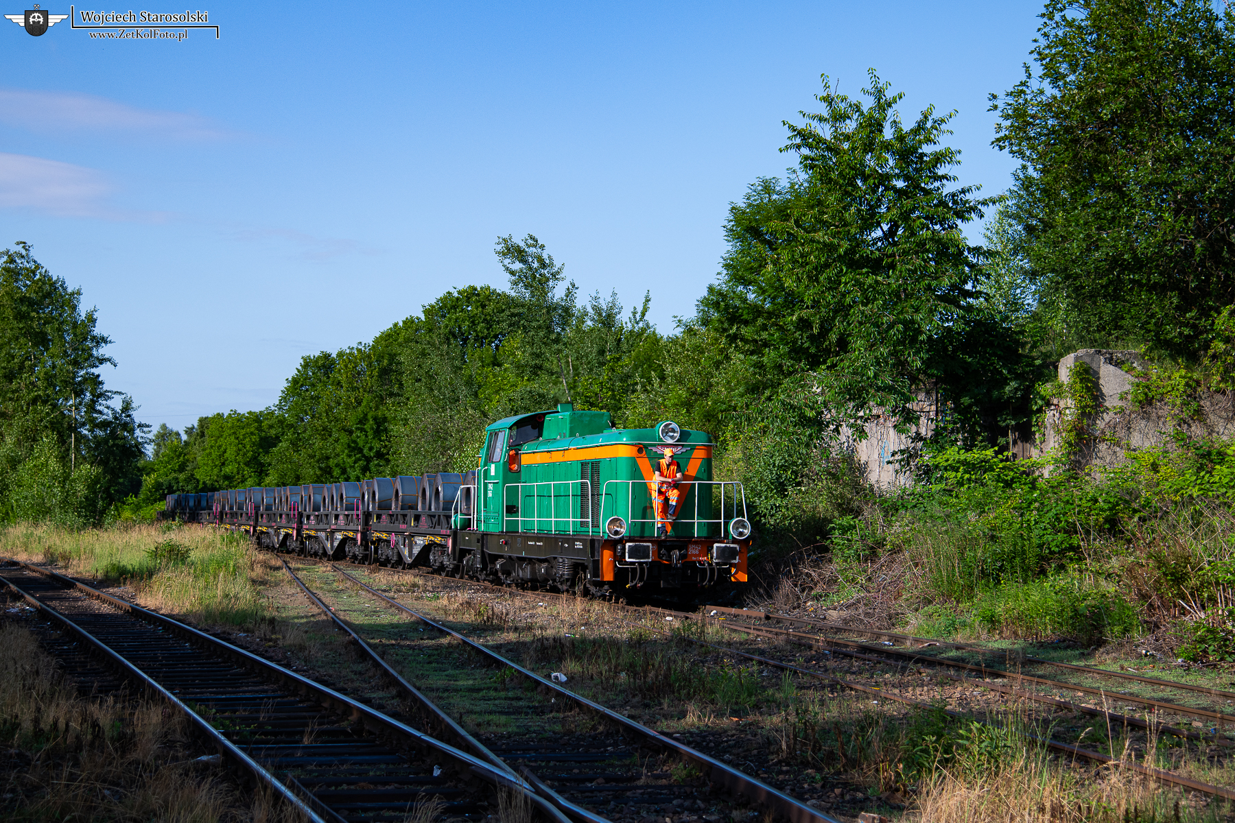 24.06.2025 | Ruda Śląska | Bocznica wydziału profili giętych huty Pokój | SM42-2166 z ładownymi platformami na haku jedzie z huty Pokój do WPG huty Pokój, mijając dawną stację Ruda Wschodnia.