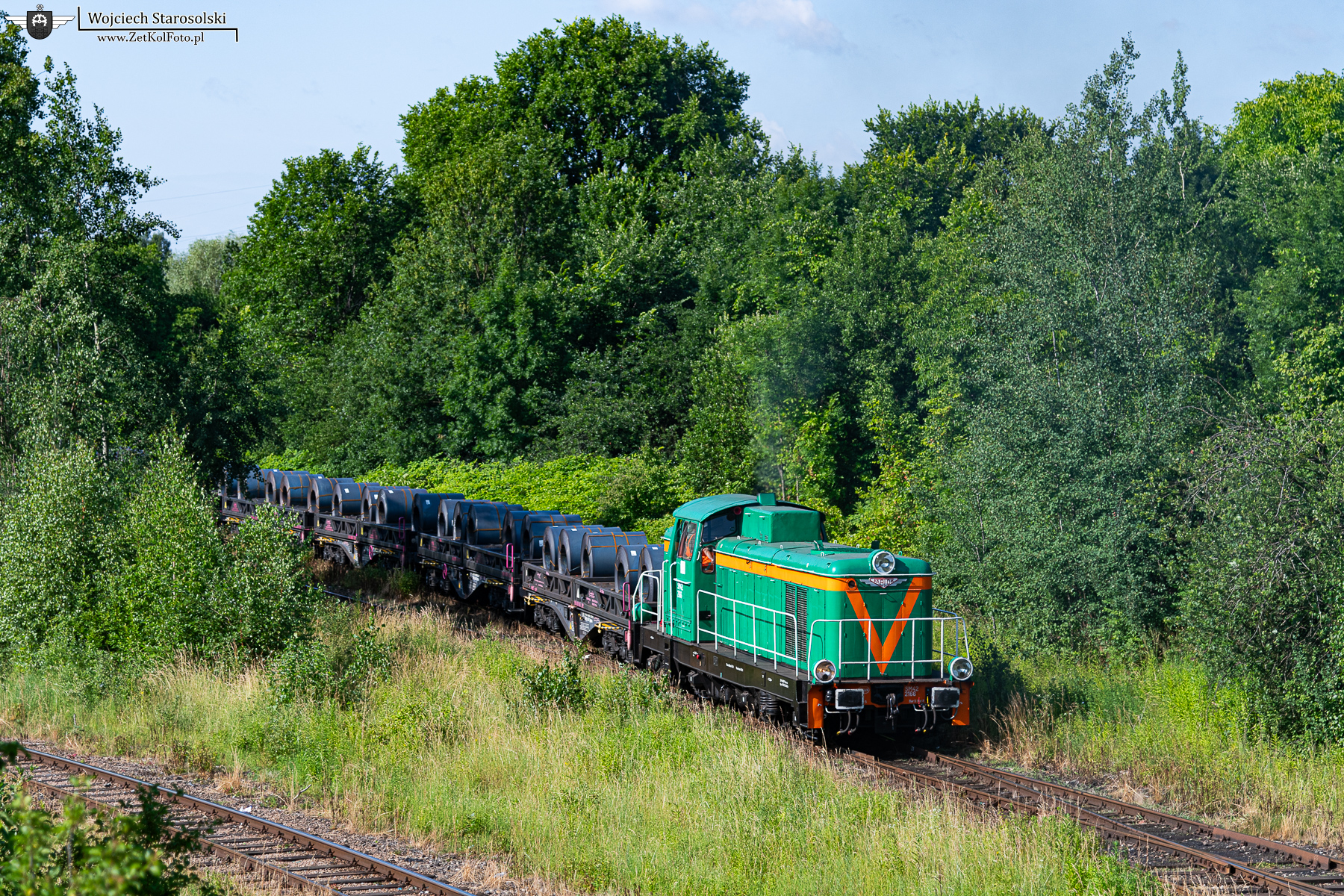 24.06.2025 | Ruda Śląska | Bocznica wydziału profili giętych huty Pokój | SM42-2166 z ładownymi platformami na haku jedzie z huty Pokój do WPG huty Pokój, mijając dawną stację Ruda Wschodnia.