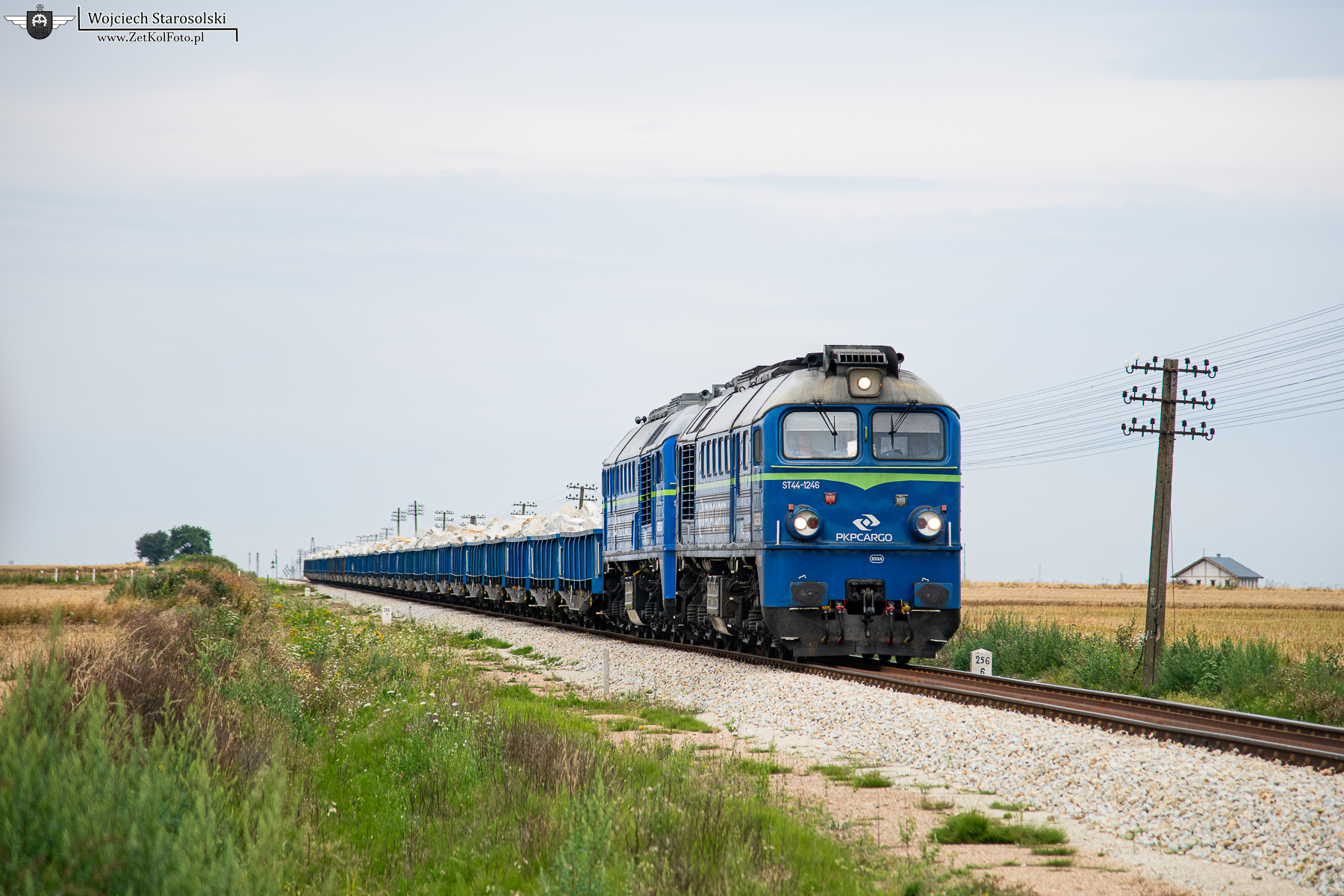 31.07.2025 | Rogoźnica | Szlak Rogoźnica-Jawor | ST44-1246 w duecie z drugą kołomną prowadzą ładowny skład węglarek niskoburtowych, jadąc w/w szlakiem w kierunku Rogoźnicy.