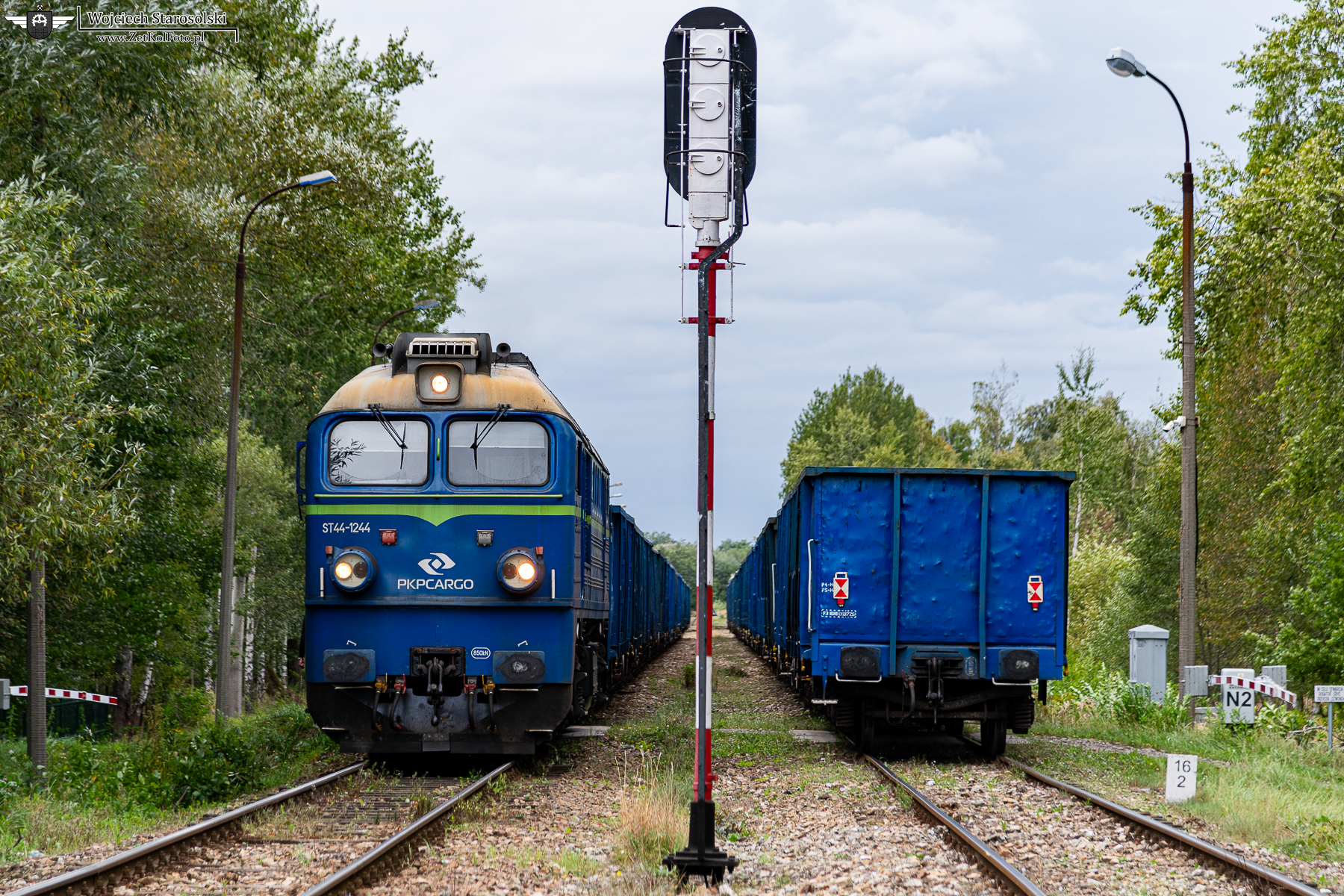 25.09.2025 | Lędziny | Stacja Hołdunów | ST44-1244 z węglarkami stoi pod semaforem wyjazdowym dwutorowej stacji węzłowej Hołdunów. Skład jedzie z KWK Ziemowit do elektrowni Jaworzno III. Obok stoi drugi skład węglarek, jadący z EJ III do Ziemowita na załadunek, również prowadzony przez "kołomnę".
