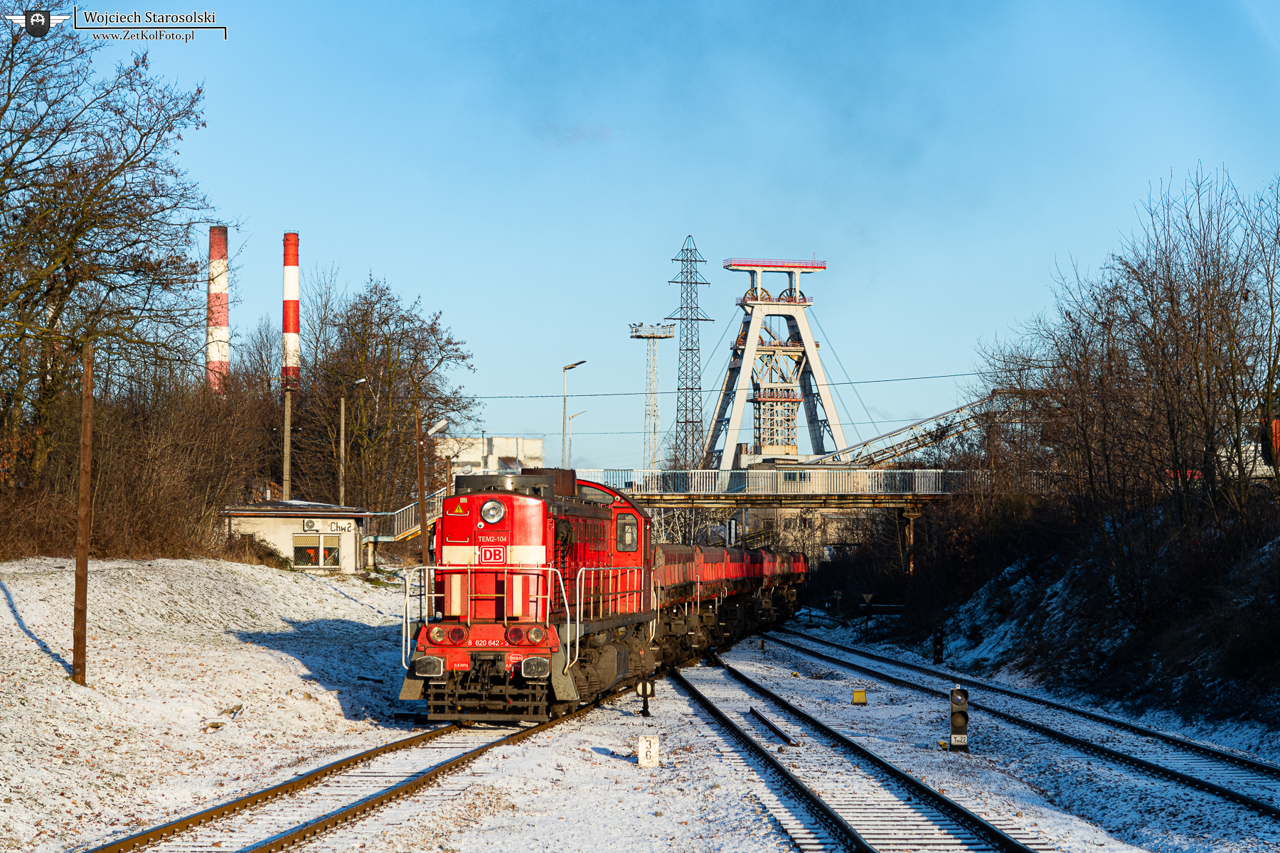 30.12.2025 | Rybnik | Stacja KWK Chwałowice, posterunek Chw-2 | TEM2-104 spycha próżne radwany po rozładunku do kopalni w celu ponownego załadunku.