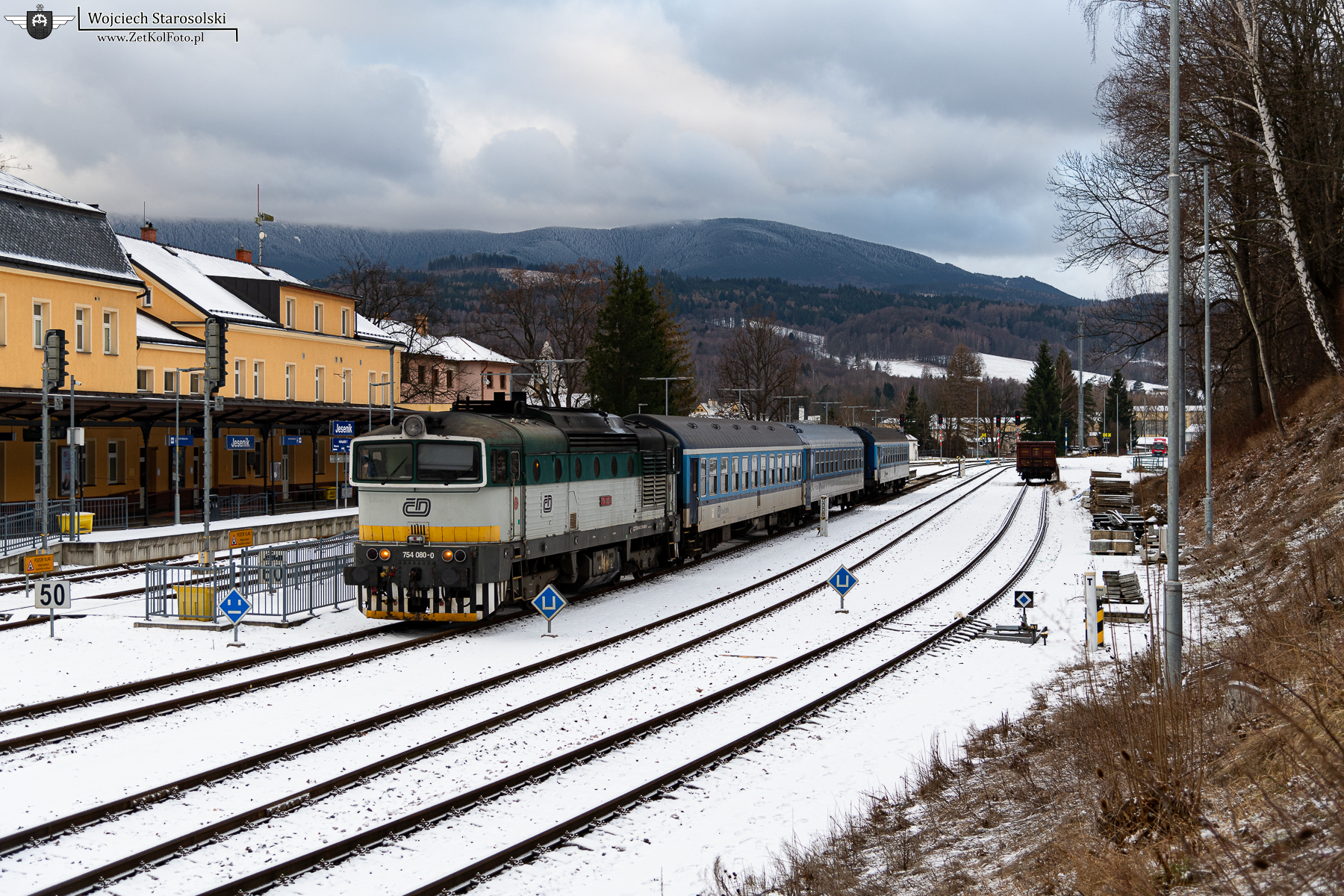 28.12.2025 | Jesenik | Stacja Jesenik | 754 080-0 manewruje z wagonami osobowymi na w/w stacji.