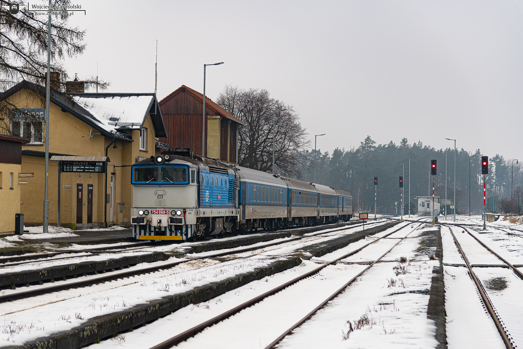 17.01.2026 | Studenec | Stacja Studenec | 754 068-5 z osobówką do Brna, mija Studenec w kierunku stacji Namest nad Oslavou.