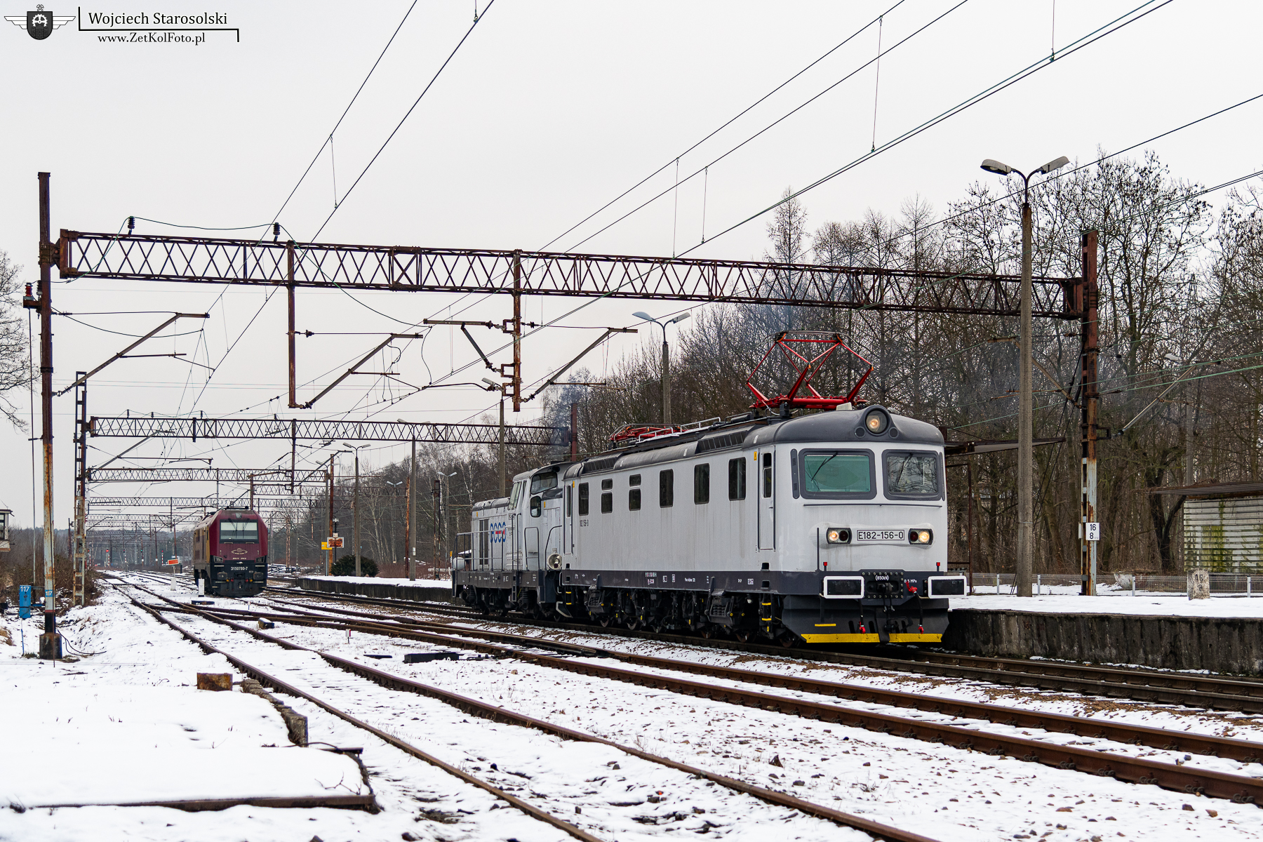19.02.2026 | Zabrze | Stacja Zabrze Makoszowy | E182 156-0 z SM42 na haku oczekują wyjazdu z w/w stacji w kierunku podg.Mizerów.