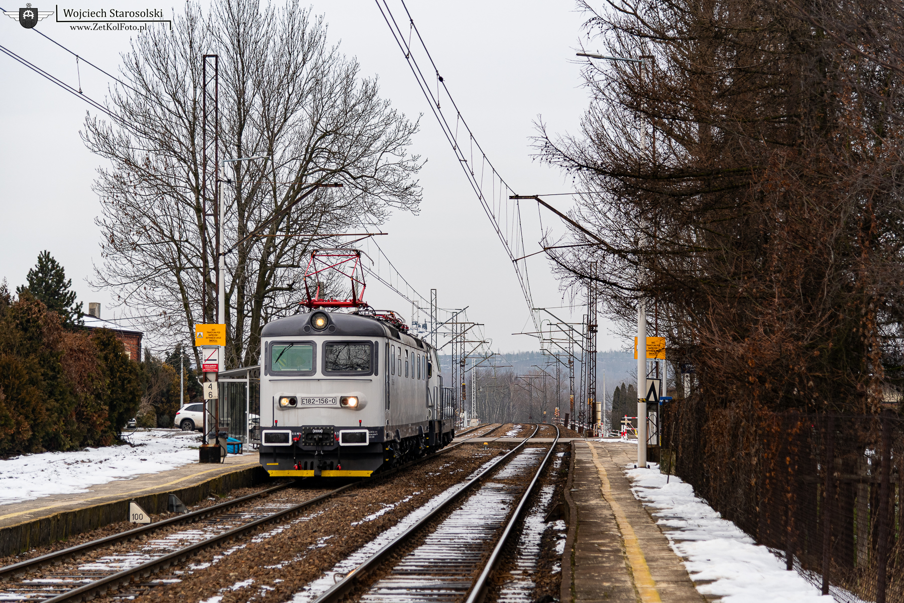 19.02.2026 | Przyszowice | Szlak podg.Mizerów-podg.Gierałtowice | E182 156-0 z SM42 na haku mija p.o. Przyszowice, w kierunku Gierałtowic.