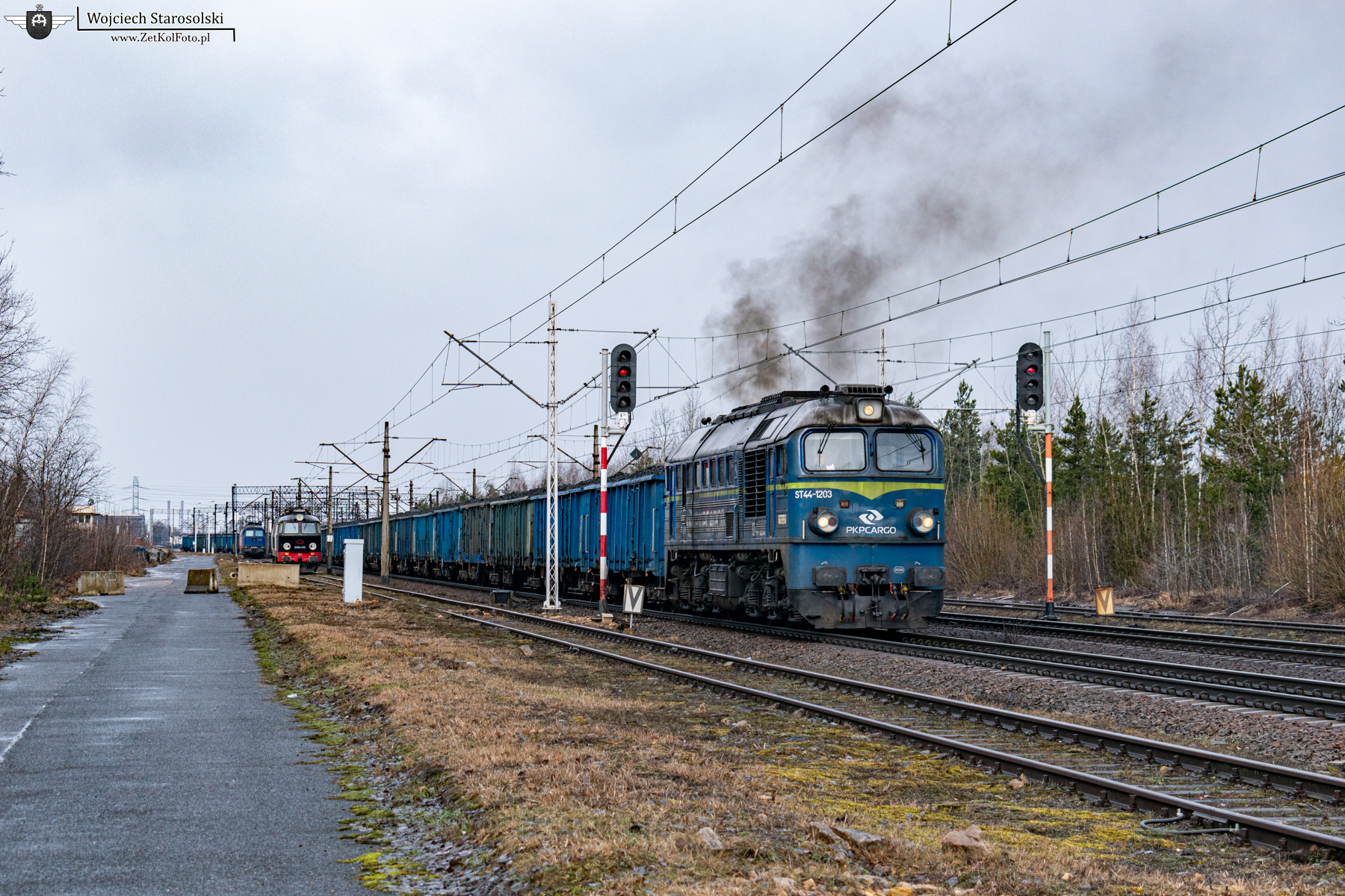 25.02.2023 | Dąbrowa Górnicza | Stacja Dąbrowa Górnicza Towarowa, okręg DTB | ST44-1203 z węglarkami wyjeżdża z okręgu DTB w kierunku DTA.