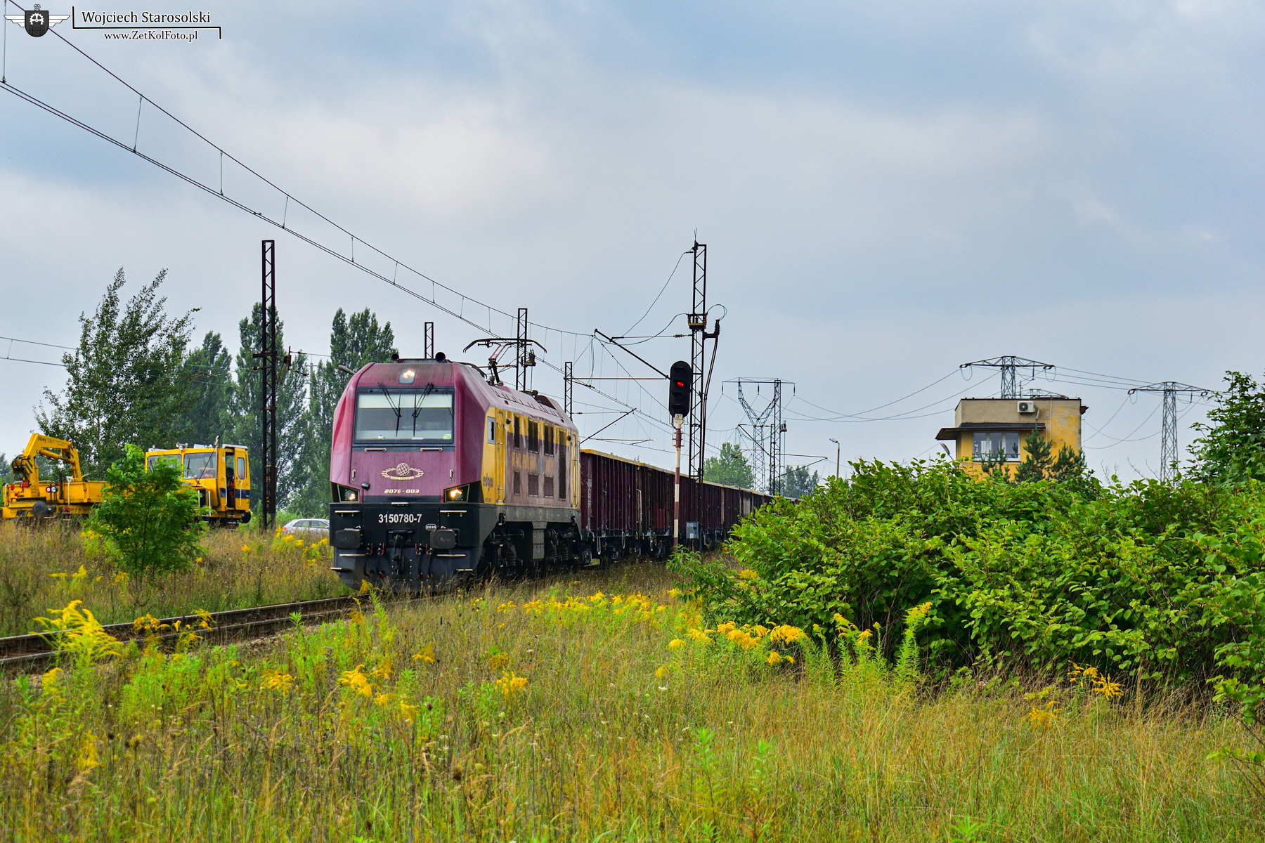 23.08.2022 | Katowice | Podg.Stawiska | 207E-003 z węglarkami mija posterunel Sk1 w kierunku Mysłowic.