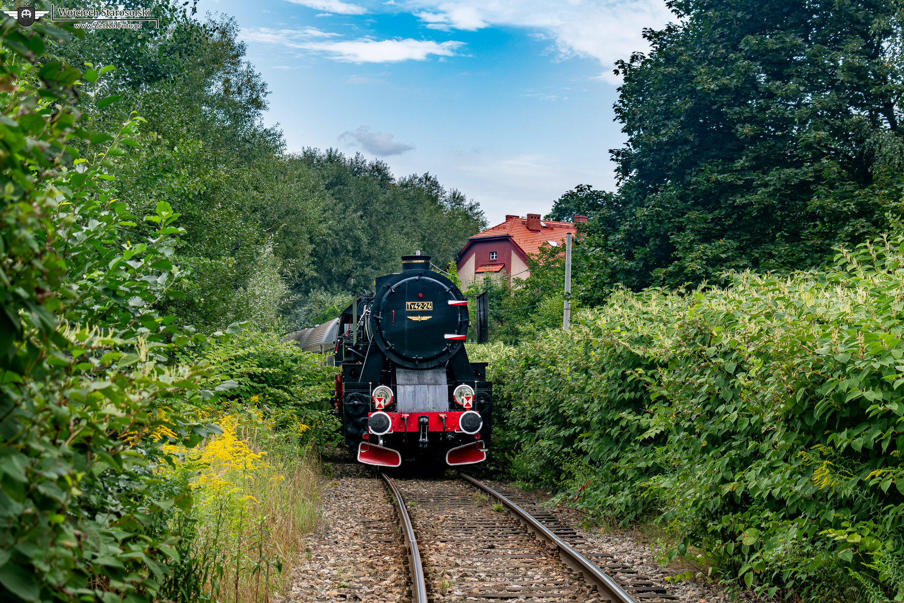 26.08.2024 | Szlak Ruda Chebzie-Zabrze Biskupice | Ty42-24 z dwoma wagonami 94A ciągnięty przez SM42 ZEM Łabędy jedzie na Biskupice.