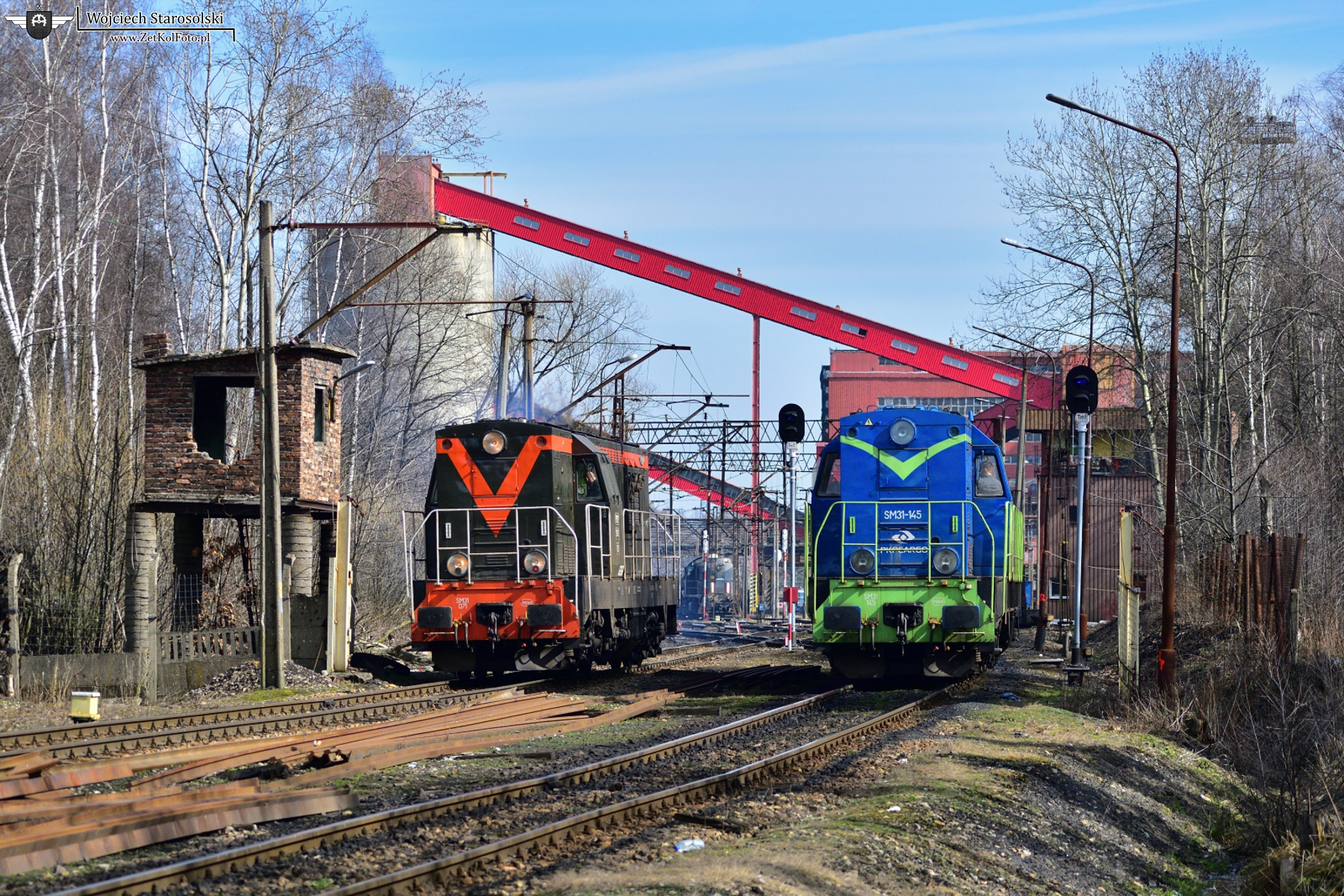 18.03.2023 | Katowice | Stacja Katowice Muchowiec Staszic | SM31-071 wyjeżdża z KWK Staszic w kierunku podg.Staszic. Obok wygaszona SM31-145 oczekuje podjęcia pracy manewrowej.