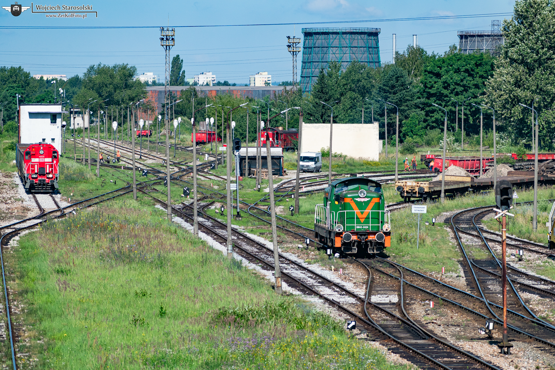 26 Czerwca 2024 roku | Ostrowiec Świętokrzyski | Bocznica huty Ostrowiec Świętokrzyski | SM42-2424 luzem zjeżdża na postój po wykonaniu manewrów z zakładowymi platformami. W tle zestawiająca skład węglarek TEM2-278 które później zaprowadzi do Bodzechowa, a jeszcze dalej wygaszona TEM2-190 oczekująca podjęcia pracy manewrowej.
