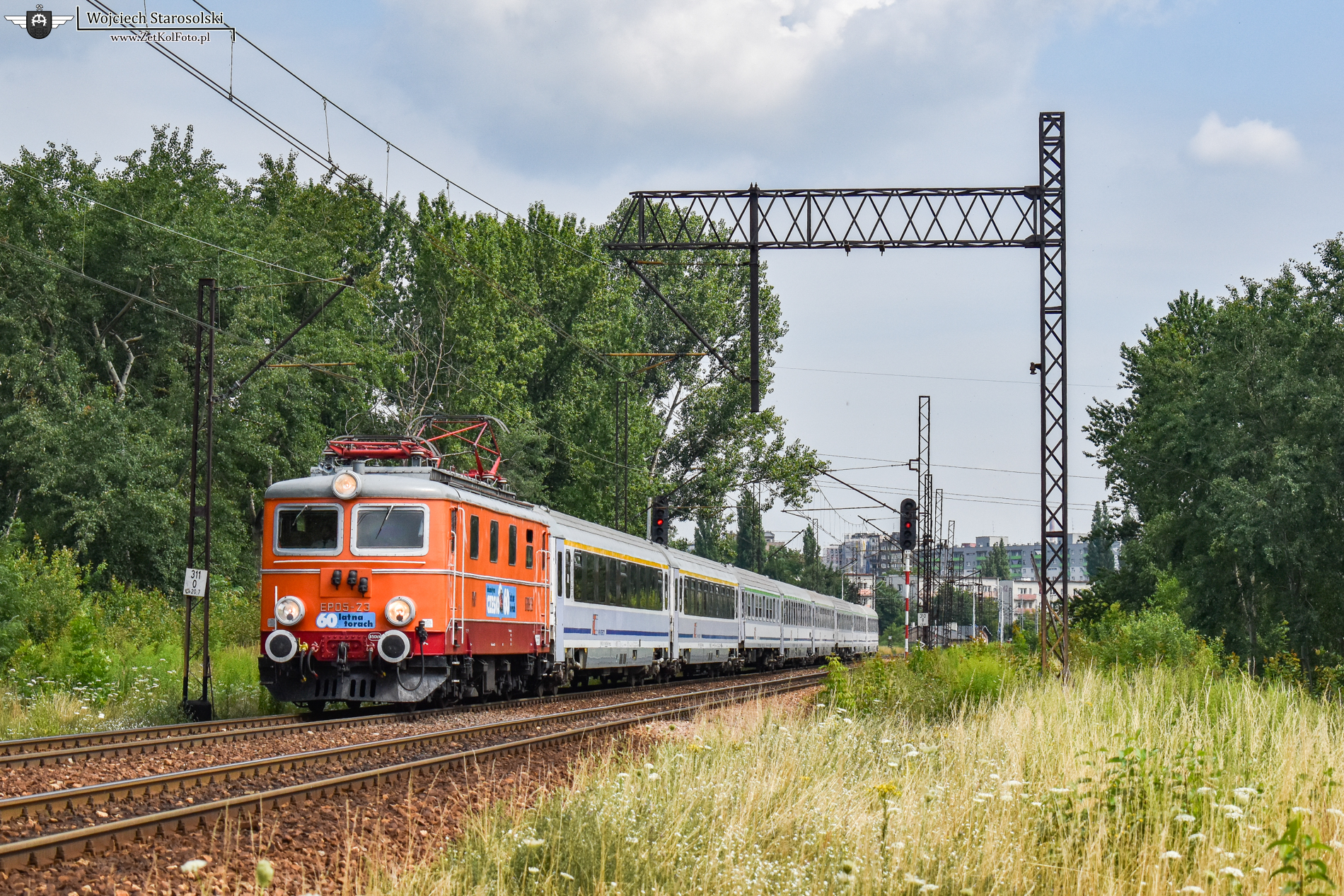23.07.2021 | Sosnowiec | Szlak Sosnowiec Gł.-Katowice Zawodzie | EP05-23 ze składem PKP Intercity wyjeżdża w kierunku Katowic.