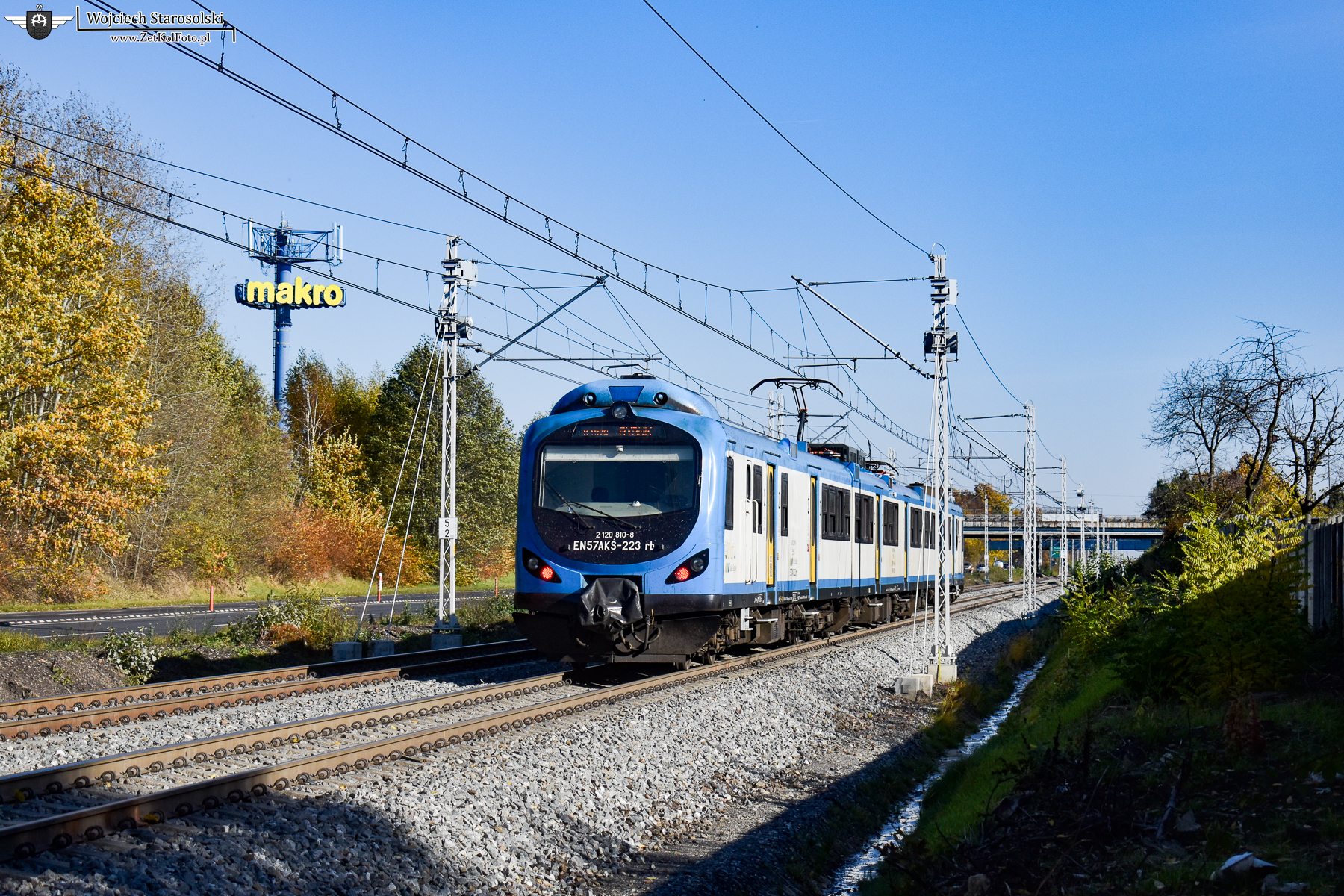30.10.2021 | Zabrze | Szlak Zabrze Biskupice-podg.Maciejów Północny | EN57AKŚ-223 z zapoznaniem rel.Gliwice-Bytom-Gliwice, jedzie powolnym tempem w/w szlakiem w kierunku Zabrza Biskupic.
