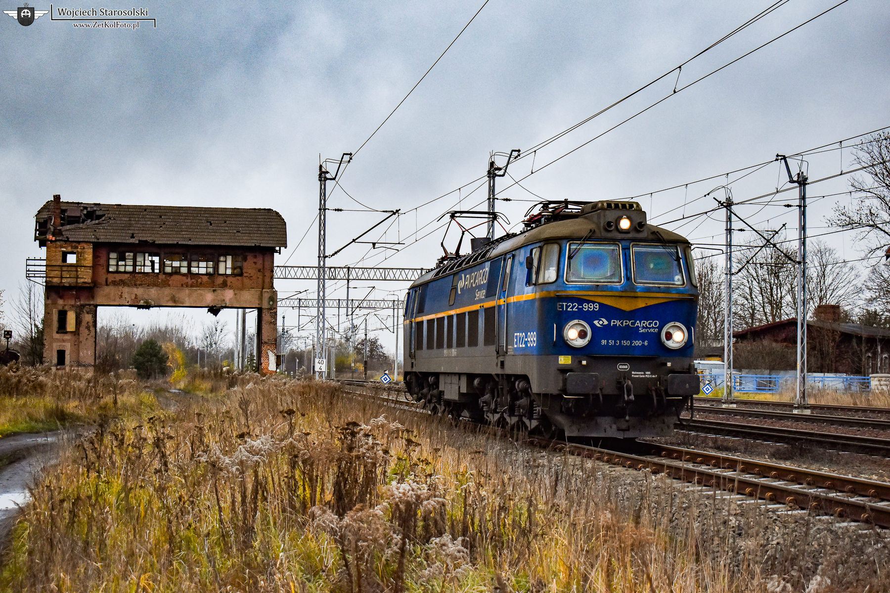 20.11.2021 | Pyskowice | Stacja Pyskowice | ET22-999 luzem przemierza powoli stację Pyskowice na której odbędzie chwilowy postój w celu przepuszczenia pociągu pośpiesznego, po czym uda się w kierunku Gliwic Łabęd. Po lewej widoczna jest powstała jeszcze przed I wojną światową nastawnia bramowa Pk5.
