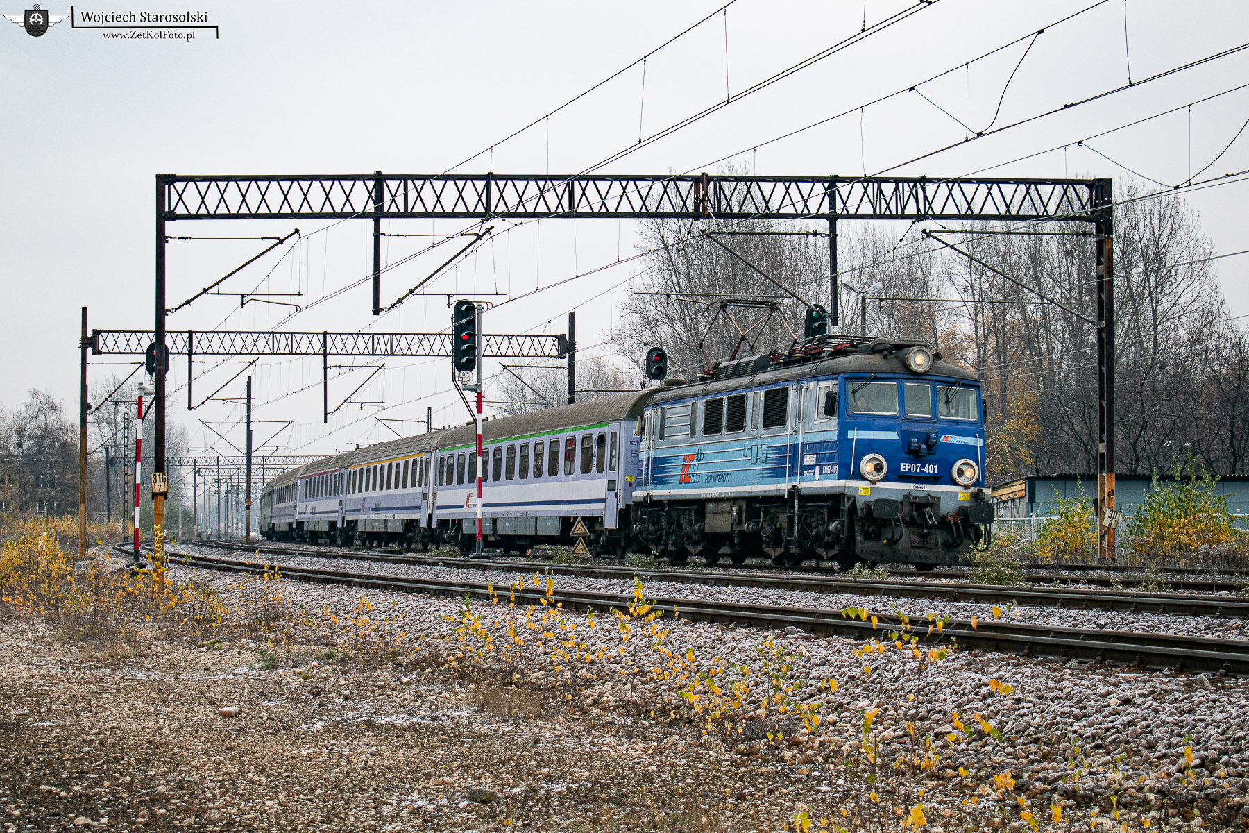 20.11.2022 | Katowice | Szlak Katowice-Katowice Zawodzie | EP07-401 z pociągiem spółki PKP Intercity jedzie w kierunku Katowic.