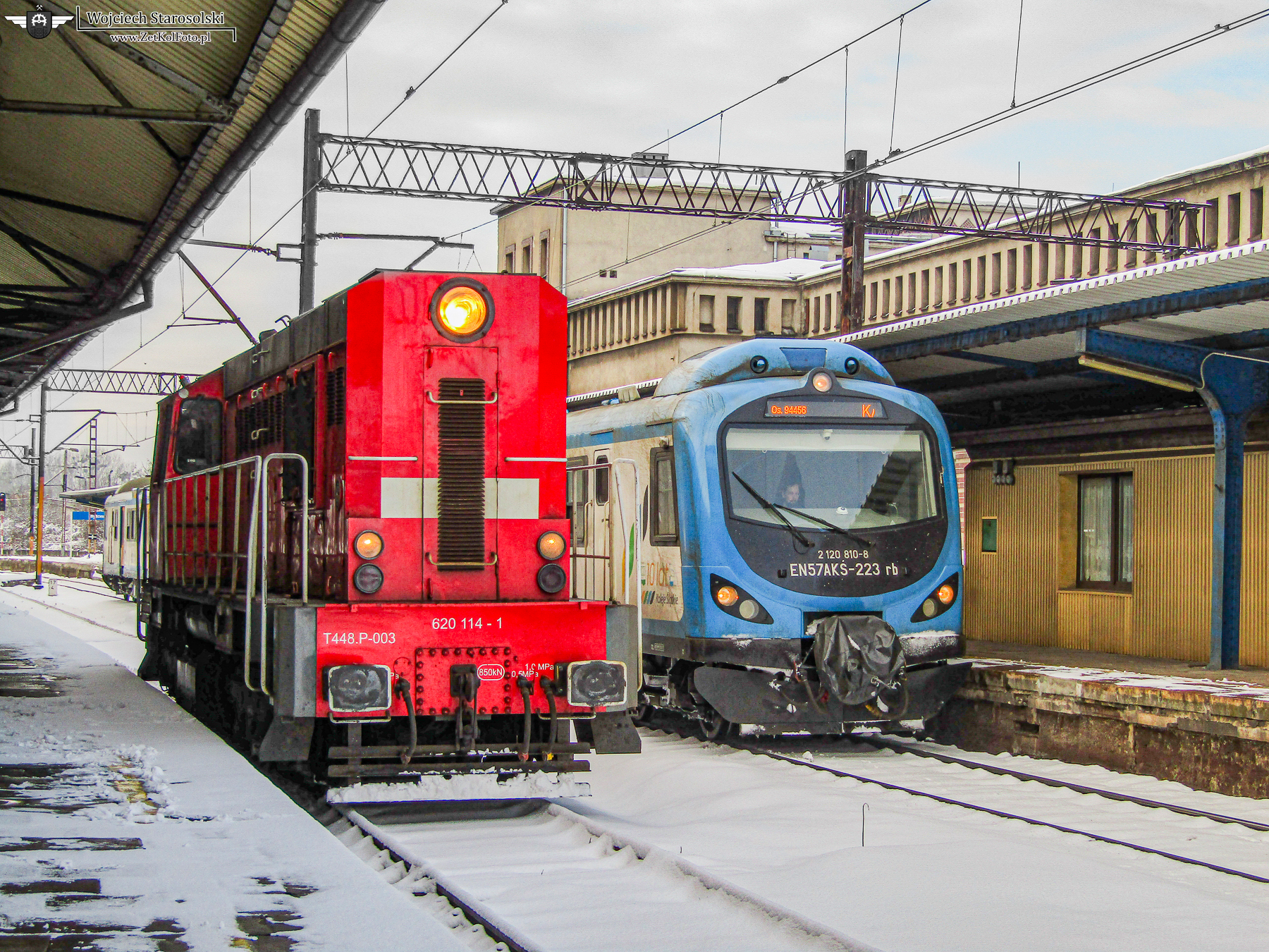 14.01.2021 | Bytom | Stacja Bytom | T448P-003 luzem oczekuje odjazdu ze stacji Bytom, obok EN57AKŚ-223 jako S8 rel.Kluczbork-Katowice odjeżdża z w.w stacji.