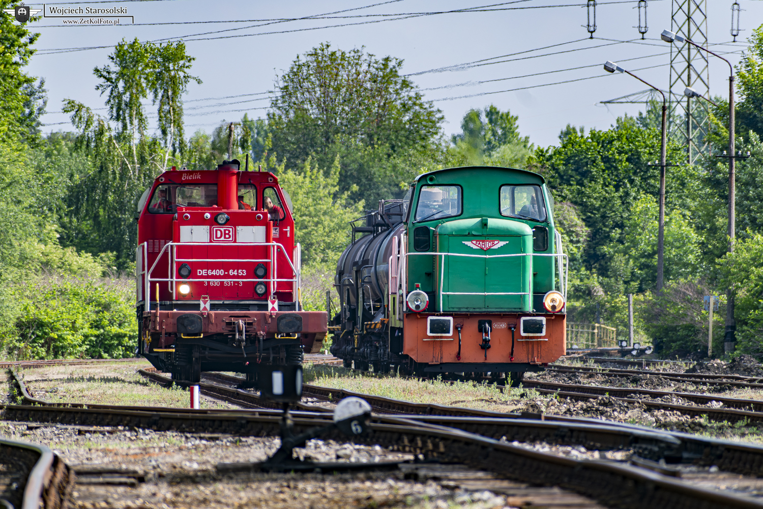 05.06.2024 | Chorzów | Tory z/o zakładów azotowych w Chorzowie | 401Da-074 z beczkami na haku oczekuje wymiany składów z widocznym obok DE6400.