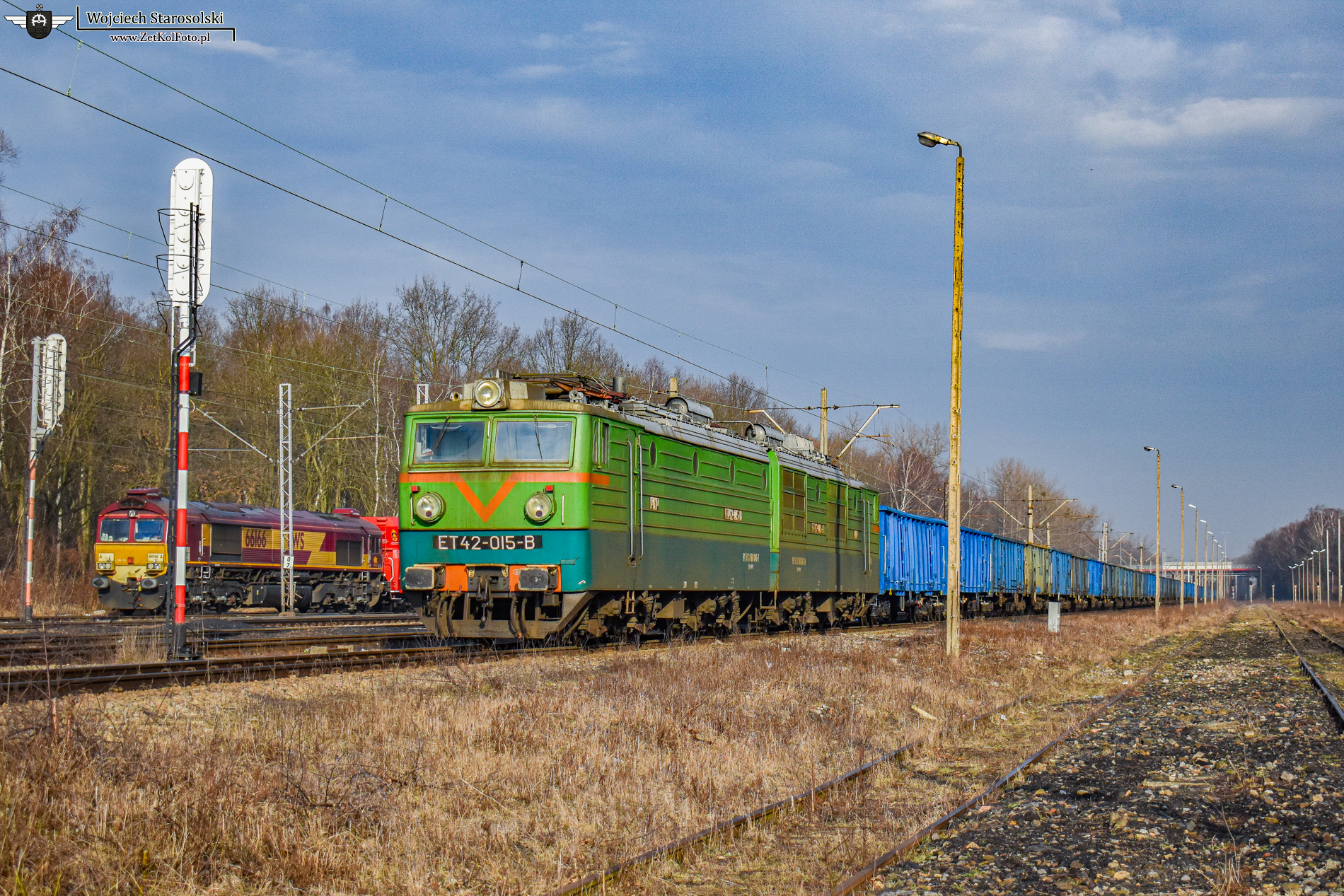 15.02.2022 | Zabrze | st.Zabrze Makoszowy Kopalnia | ET42-015 z węglarkami stoi wygaszony czołem na st.Zabrze Makoszowy/podg.Mizerów.