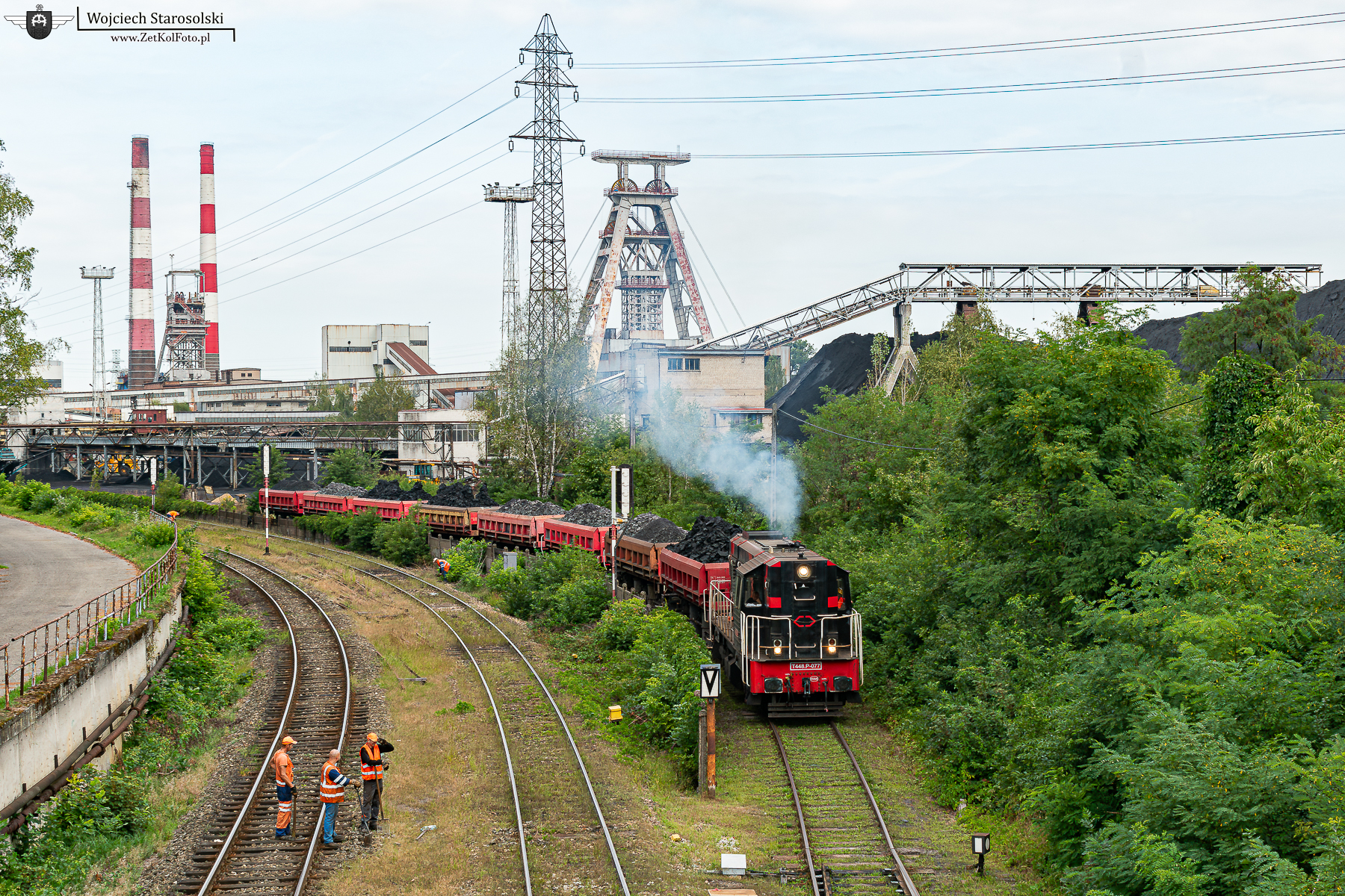27.08.2024 | Rybnik | Stacja KWK Chwałowice, okręg Chw-2 | T448P-077 z radwanami załadowanymi odpadami górniczymi widocznej w tle KWK Chwałowice wyjeżdża w kierunku KWK Jankowice.