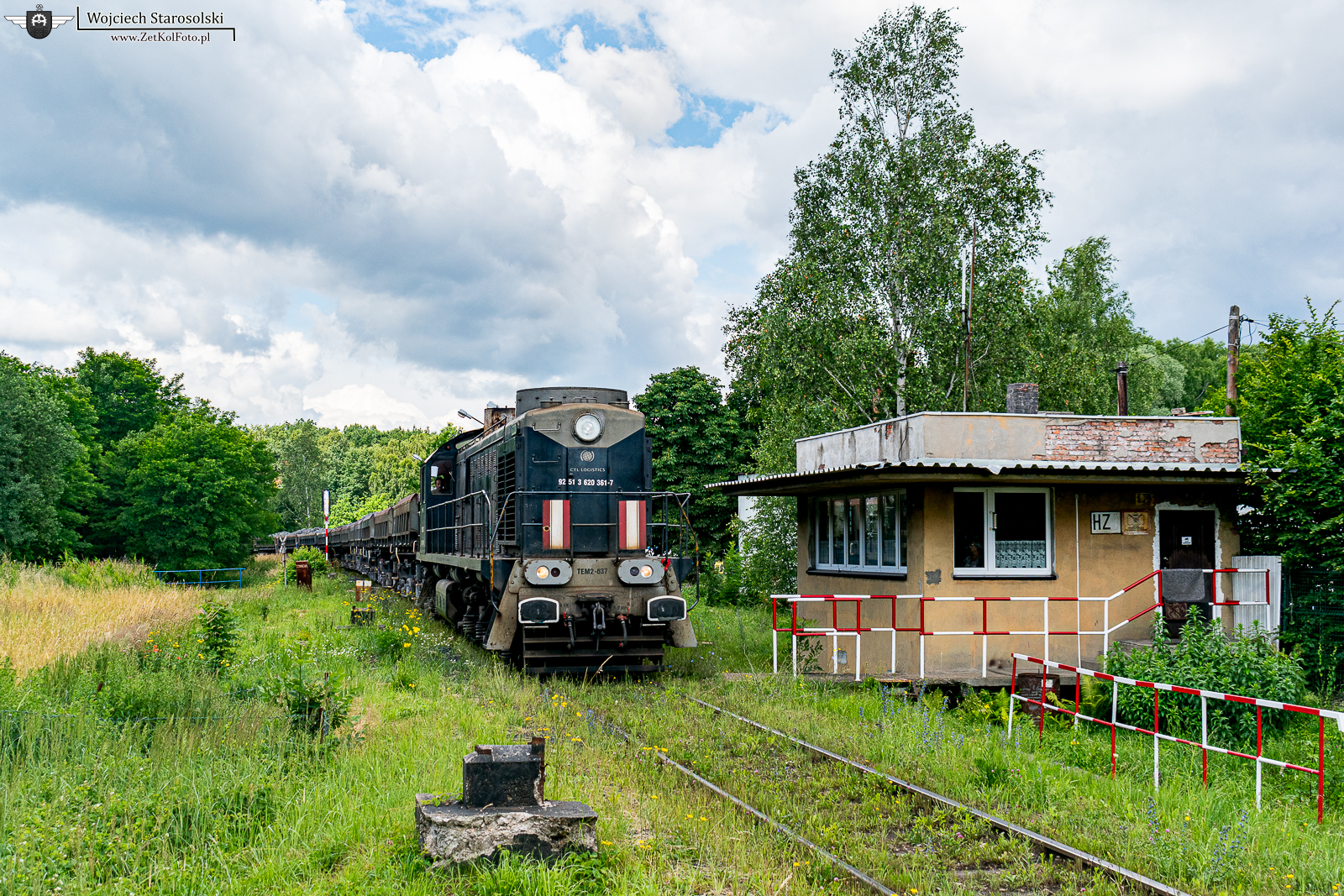 28.06.2023 | Lędziny | Posterunek blokowy Hołdunów Ziemowit (HZ) | TEM2-037 z ładownymi radwanami z KWK Ziemowit mija HZ w kierunku stacji Hołdunów. Posterunek Hołdunów Ziemowit pełni na tą chwilę pełni funkcje posterunku odstępowego na szlaku pomiędzy stacją węzłową Hołdunów a podg.Lędziny. Nastawnia posiada urządzenia kluczowe. Cofnijmy się jednak do roku 1985... Posterunek ruchu jakim jest Hołdunów Ziemowit, wtedy był ruchliwą stacją węzłową, która umożliwiała wyjazd w kierunku Podg.Lędziny i dalej na sieć PKP w kierunku Górek, lub też do KWK Ziemowit, oraz odchodziło tu też drugie, ale bezpośrednie połączenie do tej samej kopalni. Mało tego, przez stację wtedy od niedawna można było przejechać elektrowozem. Pozostałością po tym widoczną na zdjęciu jest fundament słupa trakcyjnego. Nastawnie były tutaj dwie, widoczna na zdjęciu była wtedy nastawnią wykonawczą HZ1. Oznacza to, że stacja ta posiadała dwa okręgi nastawcze, co akurat w przypadku obu odmian urządzeń mechanicznych nie jest niczym nadzwyczajnym. Deelektryfikacja linii ze stacji Dąbrowa do podg.Lędziny przypadła na rok 2000, czyli tak jak na sporej części sieci dawnego PMP-PW. Wcześniej wspomniana linia na której się znajdowała ta stacja powstała w 1956 roku i zarządzana była przez KP Maczki-Bór, a obecnie przez firmę Maczki-Bór S.A. W tej chwili korzystają z niej składy jadące do i z KWK Ziemowit oraz KWK Piast z odpadami górniczymi w/w kopalń prowadzone przez Omniloko, oraz pociągi DB Cargo z węglem także z dwóch wspomnianych kopalń do elektrowni Jaworzno III. Sporadycznie zdarzają się też pociągi CTL'u do elektrowni Jaworzno II oraz pociągi PKP Cargo, których relacji akurat nie znam.