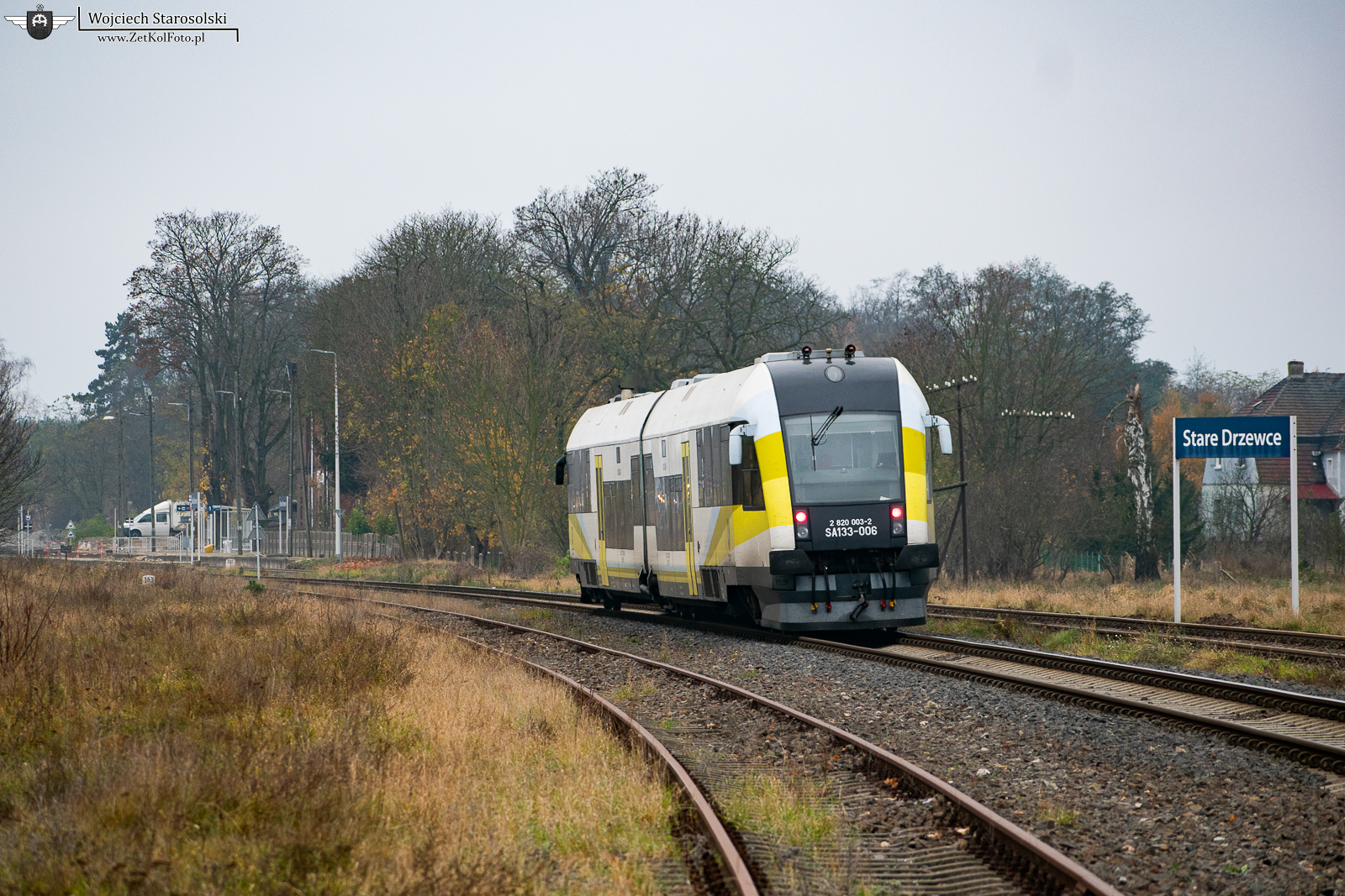 11.11.2024 | Stare Drzewce | Szlak podg.Głogówko-Stare Drzewce | SA133-006 jako osobówka z Leszna do Głogowa, mija dawną stację stare Drzewce, jadąc w kierunku podg.Głogówko.