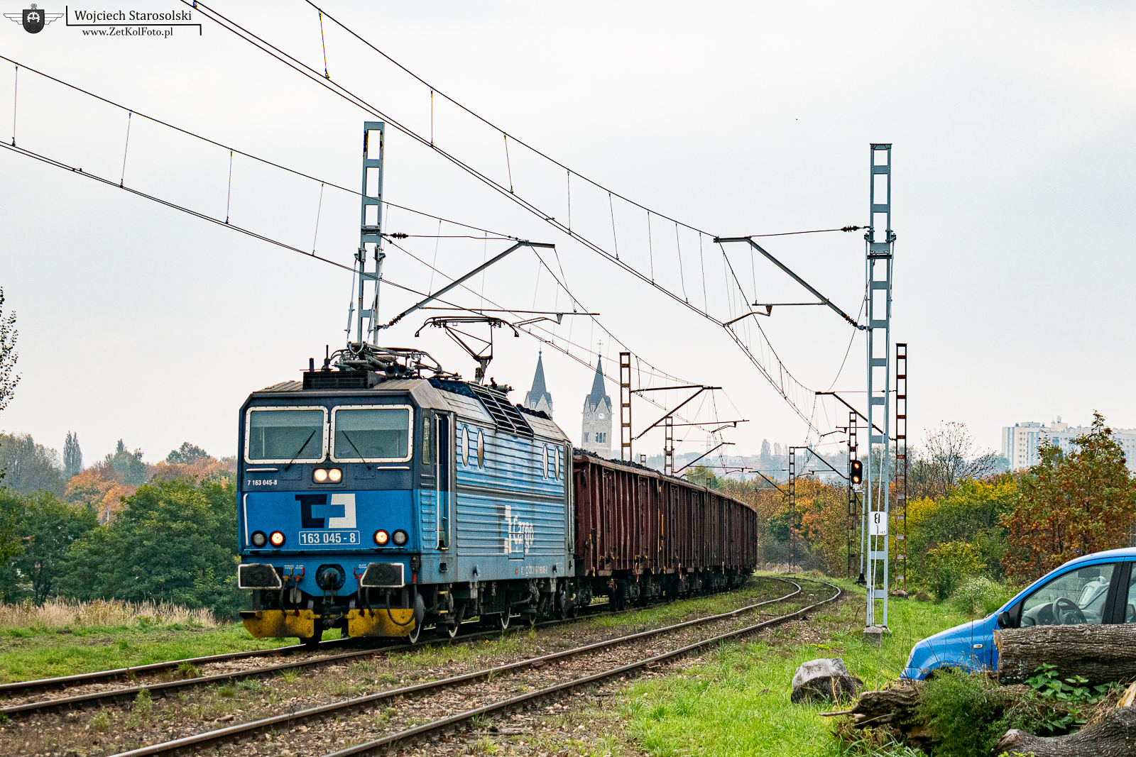 14.10.2022 | Ruda Śląska | Szlak Ruda Kochłowice-Ruda Bielszowice | 163 045-8 prowadzi węglarki w/w szlakiem w kierunku Bielszowic.